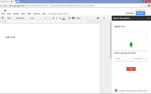 Speech Recognition appears in the Add-on menu after being installed from the Gallery. Once started, a speech recognition sidebar opens that allows the user to specify the language being spoken. In addition to handling English well, I’ve heard from my World Language colleagues that the Spanish recognition is quite good. The Add-on begins to work with the click of a start button and stops by using the same button. Punctuation is included when the user verbally declares where it should be (edit: some folks have reported that punctuation is a weakness, see the comments...)